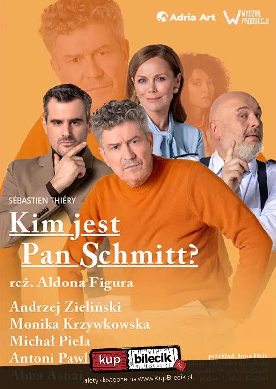 bilety: Wyobraź sobie sytuację, w której budzisz się rano i odkrywasz, że jesteś kimś zupełnie innym niż dotychczas. Z taką sytuacją mierzy się bohater kultowej komedii Sébastiena Thiéry"ego. W lawinie zaskakujących i zabawnych sytuacji, "Pan Schmitt" będzie musiał odpowiedzieć sobie na jedno, bardzo ważne pytanie: Kim naprawdę jestem? Pewnego dnia wszystko w życiu bohatera zmienia się nie do poznania. Odkrywa, że ma inny zawód, inne ubrania i książki w mieszkaniu, on i żona inaczej się nazywają, a nawet mają już dorosłe dziecko. Świat próbuje mu wmówić, że jest panem Schmittem, a zaprzeczenie temu może się dla niego źle skończyć... W tej zwariowanej komedii "Pan Schmitt" zaczyna lawirować i udaje kogoś, kim nie jest. Jednocześnie usiłuje nie zdradzić samego siebie i tego, w co wierzy. Mnożą się przez to absurdalne sytuacje, a także zabawne nieporozumienia. Czy istnieją granice kompromisu, na jaki człowiek zdolny jest pójść dla świętego spokoju? Kim jest Pan Schmitt? - to więcej niż komedia artyści: Andrzej Zieliński, Monika Krzywkowska, Michał Piela, Antoni Pawlicki, Alma AsuaiWyobraź sobie sytuację, w której budzisz się rano i odkrywasz, że jesteś kimś zupełnie innym niż dotychczas. Z taką sytuacją mierzy się bohater kultowej komedii Sébastiena Thiéry"ego. W lawinie zaskakujących i zabawnych sytuacji, "Pan Schmitt" będzie musiał odpowiedzieć sobie na jedno, bardzo ważne pytanie: Kim naprawdę jestem? Bilety do nabycia na: KupBilecik.pl |